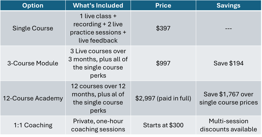 Personalized Feedback & Practice: There will be a new course taught monthly; with weekly practice sessions; real-time feedback and coaching; recordings of the workshop to play at your convenience.